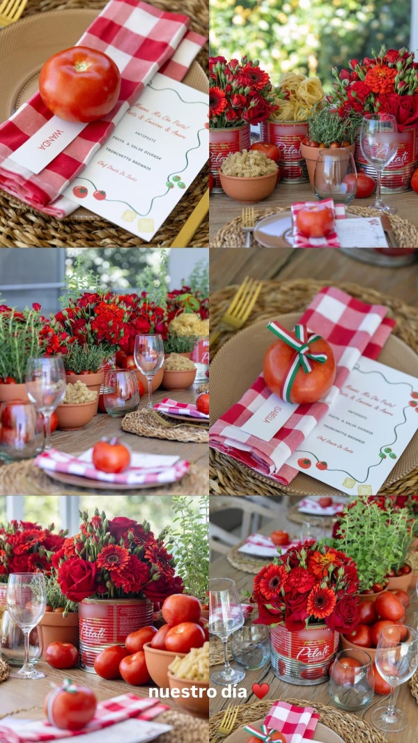 La ambientación de la mesa estuvo cuidadosamente pensada para transportar a Italia: individuales de fibras naturales, platos en tonos tierra, servilletas a cuadros rojos y blancos personalizadas con los nombres de cada invitado, y un tomate fresco sobre cada servilleta como homenaje al producto estrella del menú. El centro de mesa combinó flores rojas, latas de tomate decorativas y tarros de pasta seca, evocando las grandes comidas familiares italianas.