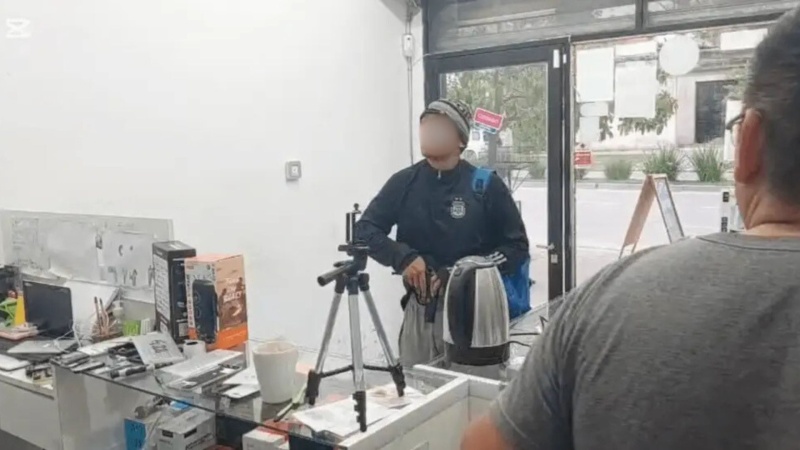 Una vez adentro, amenazó al empleado con un arma de fuego y le exigió la entrega de todos los celulares que había en exhibición. Sin embargo, el trabajador logró enfrentarlo y ponerlo en fuga, evitando el robo. En medio de la huida, el delincuente dejó una mochila azul dentro del comercio.
