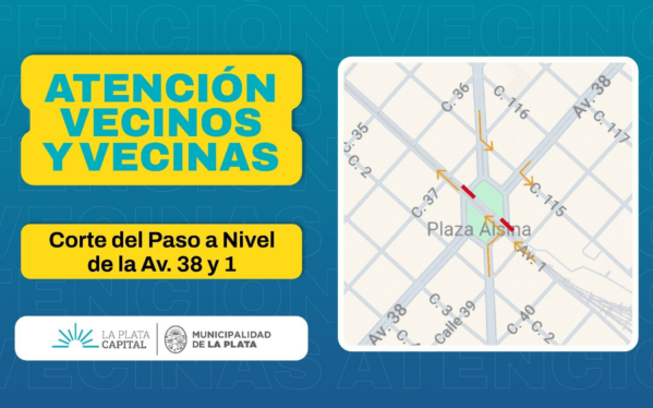 La Municipalidad de La Plata informó que, a partir de este lunes por la noche, permanecerá interrumpido el tránsito vehicular en el paso a nivel de avenida 1 y 38, en ambos sentidos de circulación. La medida se debe al avance de obras viales en la zona y se mantendrá por un plazo aproximado de dos semanas.
