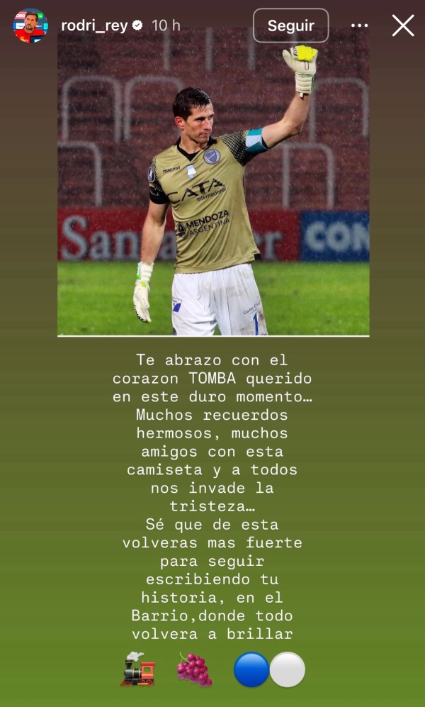 Junto a una imagen siendo el arquero y capitán del Tomba en un compromiso que se disputó bajo la lluvia escribió: "Te abrazo con el corazón Tomba querido en este duro momento. Muchos recuerdos hermosos, muchos amigos con esta camiseta y a todos nos invade la tristeza. Sé que de esta volverás más fuerte para seguir escribiendo tu historia, en el Barrio, donde todo volverá a brillar"