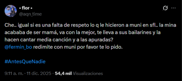 El jueves, Muni visitó el stream Antes Que Nadie y deslizó con humor e ironía que no se sintió cómoda en su visita a Se Fue Larga, ya que preparó una gran puesta en escena con bailarines, acababa de ser madre, y terminó quedando para lo último del programa. El hecho fue recalcado por fans en redes sociales.