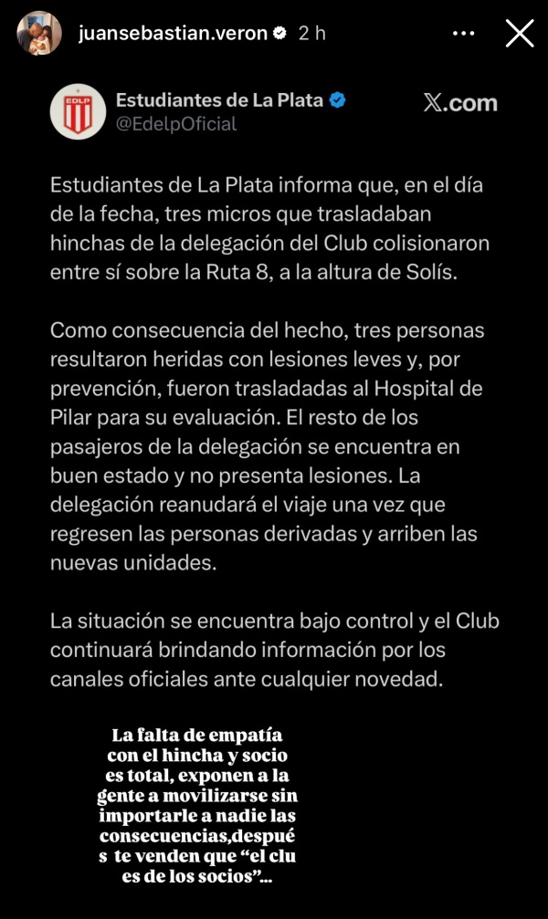 Cómo es habitual Sebastián Verón utilizó si cuenta de instagram y en una historia sentenció: "La falta de empatía con el hincha y socio es total, exponen a la gente a movilizarse sin importar a nadie las consecuencias, después te venden que "el clu es de los socios".