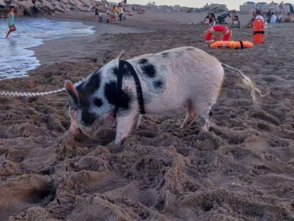 Mientras que la mayoría de personas optan por pasear a sus perros convencionales por la playa, esta pareja eligió caminar junto a su particular mascota en Mar del Plata