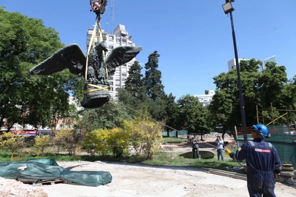 Volvió a su sitio original el águila de la Plaza Italia de La Plata y la puesta en valor entró en la recta final