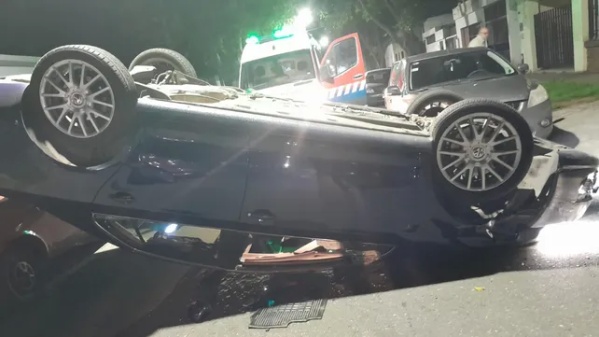 Un borracho al volante le tocó bocina a un auto estacionado en 9 y 32, se estrelló, volcó y se salvó de milagro